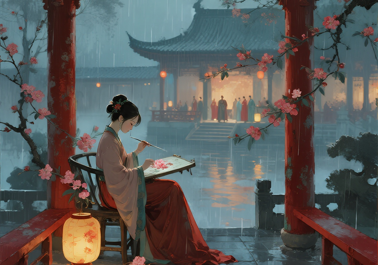 暮春的雨丝缠绕着庭前海棠,我坐在朱漆剥落的回廊下,指尖银针起落间,绢面上渐次绽开胭脂色的重瓣。远处笙箫笑语阵阵飘来,夹杂着葡萄酒的醇香——是我的庶妹苏玉茹又在宴请那些追捧她的文人墨客。