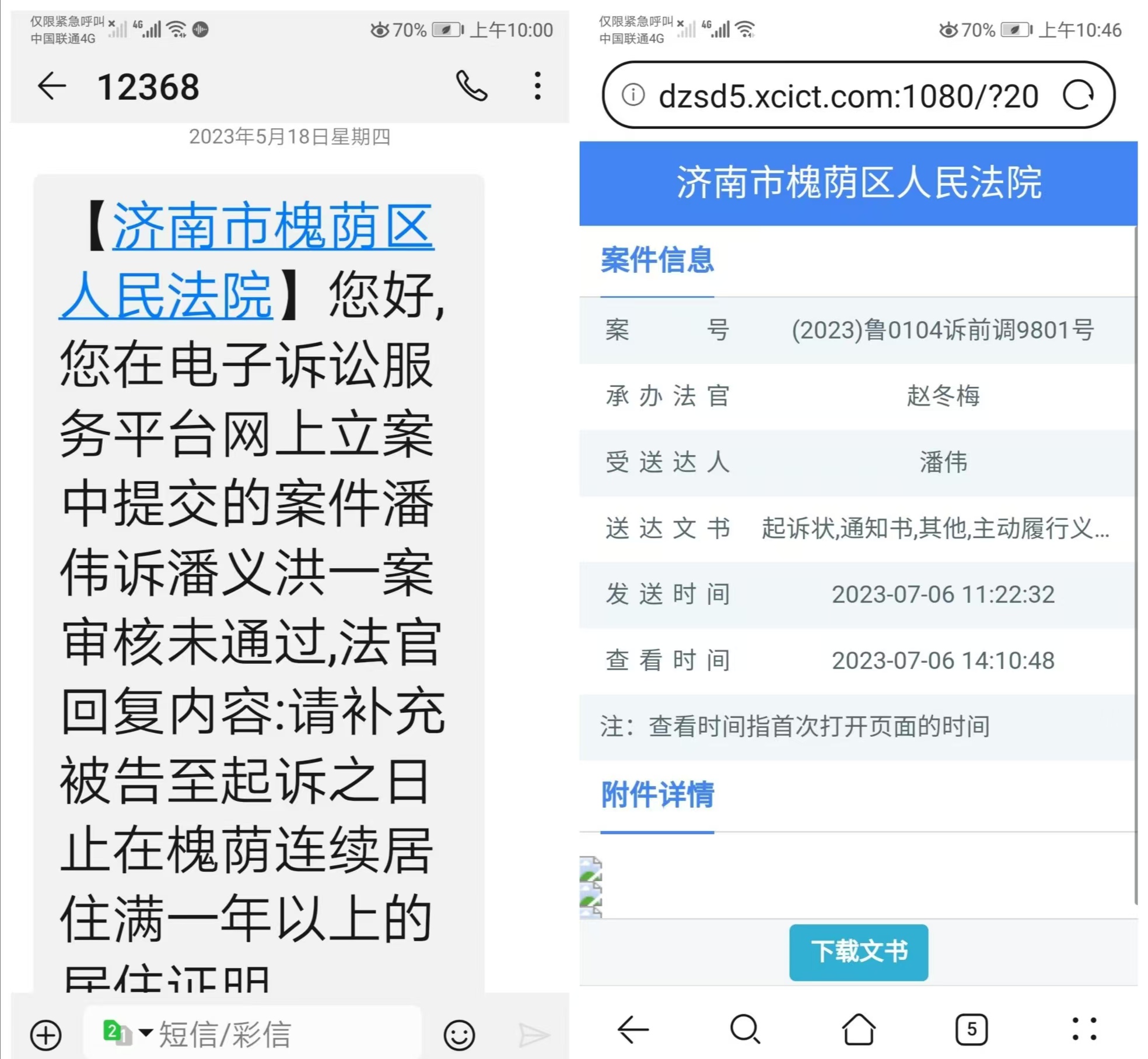 阻挠立案,维权受阻2023年5月17日,潘伟决定通过法律途径维护自己的权益,在“人民法院在线服务山东”提交了对潘义洪的民事诉讼。然而案件并没有提交成功,无奈之下前往槐荫区法院现场立案。次日法院回复要求补充被告至起诉之日止在槐荫连续居住满一年以上的居住证明,本就对法律流程不甚了解,只能选择诉讼服务热线在线询问,却得到了一个无法打通的电话号码,而这次立案最终因证据不足而撤诉。