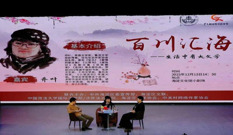 当日常琐碎淹没了诗意,我们该如何从烟火生活里发现并创造出震撼人心的“大文学”?2025年12月13日,由中共海淀区委宣传部、海淀区文联、中国政法大学国际法学院/涉外法治学院主办,海淀区作家协会、中关村网络作家协会承办的“百川汇海·作家大讲堂”第五期活动在海淀黄庄文化馆小剧场开讲。茅盾文学奖、鲁迅文学奖双料得主乔叶以“生活中有大文学”为主题,与中国社会科学院文学所研究员、中国当代文学研究会常务副秘书长徐刚,中国作协会员、中国报告文学学会理事仇秀莉展开深度对话,为现场200余位观众呈现了一场兼具思想深度与生活温度的文学盛宴,活动由张顺宇主持。