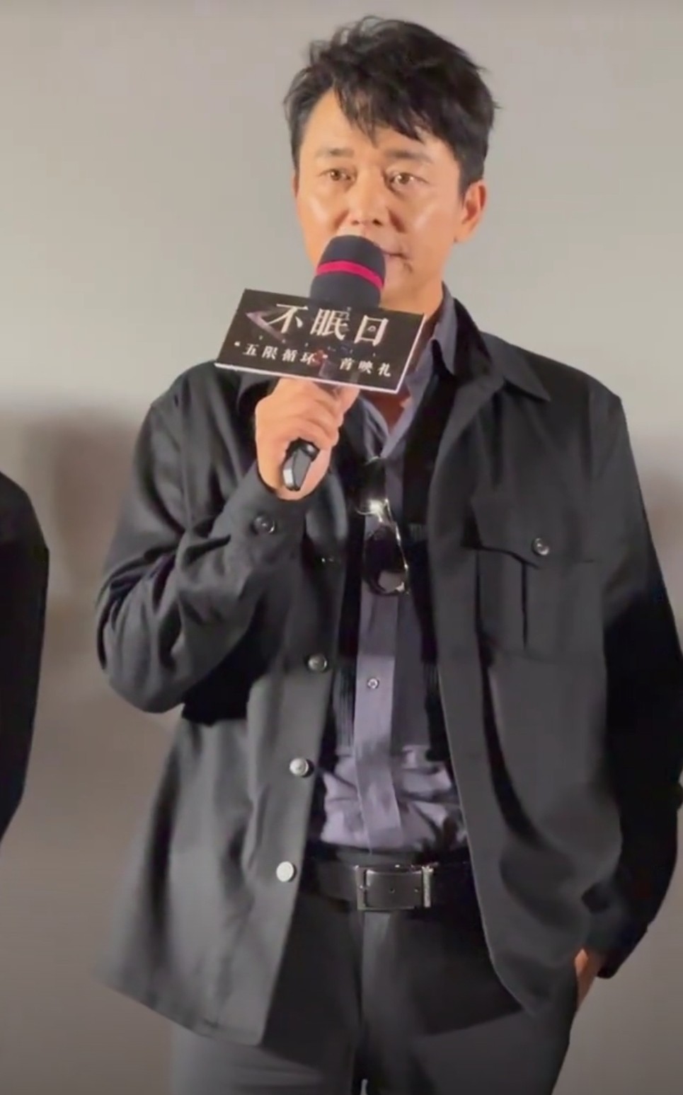 剧宣当天,刘奕君身穿深蓝色系衬衣搭配黑色夹克衫和西装裤,一黑到底,既低调又有气场。