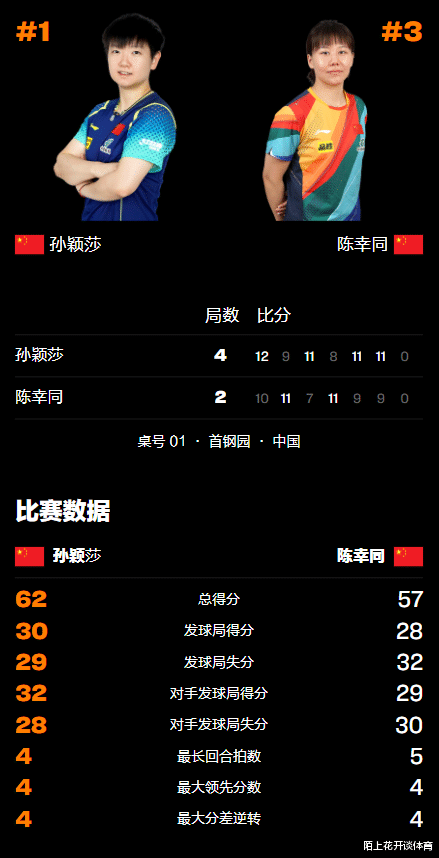陈幸同第一局大好局面没有拿下,也在一定程度上,影响了自己的心态,第二局一上来的失误频出,把握机会能力极强的孙颖莎,也强势取得了4-0的开局,不过在陈幸同控制住失误后,顽强在局末将比分反超为了10-8,并且以11-9扳平大比分。