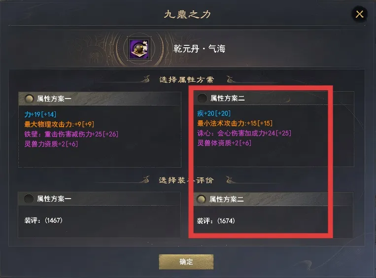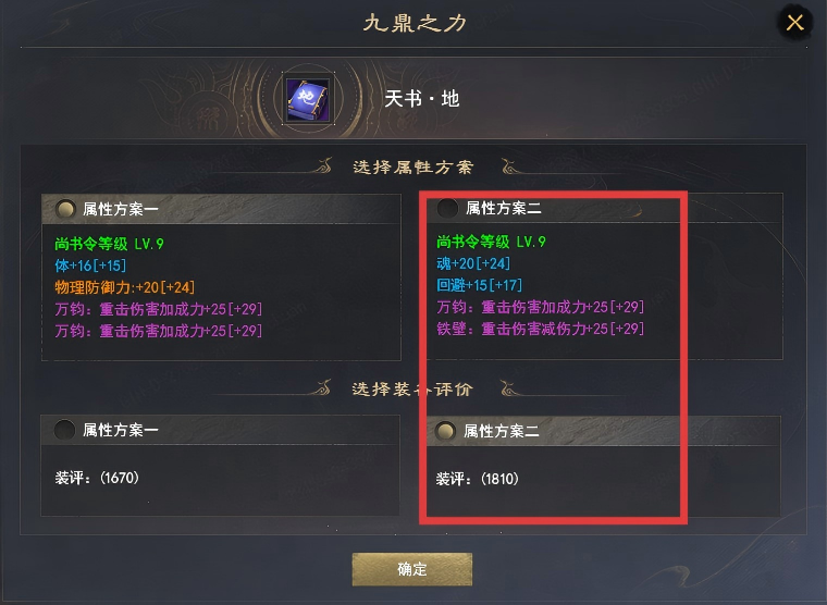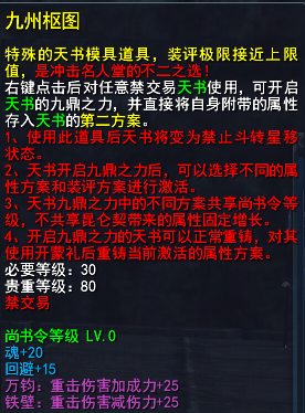 策划:将道具对禁交易的天书、乾元丹使用后,将开启天书、乾元丹的九鼎之力,并会把模具属性存入九鼎之力的第二方案,存入后,少侠可以选择激活第二方案的装评