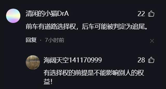 看看网友怎么说!前车有道路选择权,后车可能被判定为追尾。