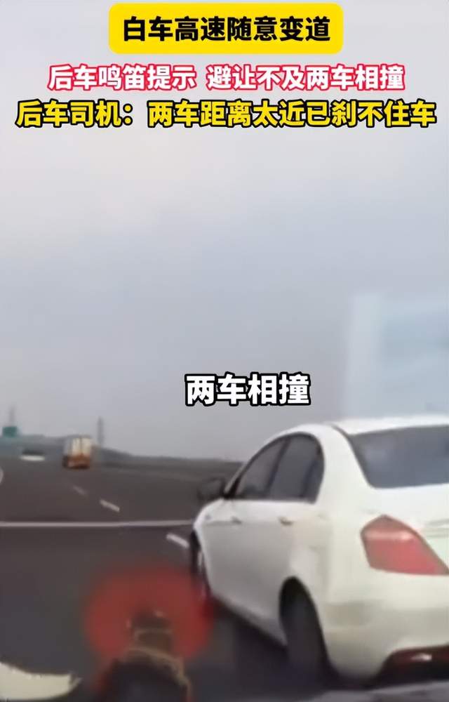“后车鸣笛提示,避让不及,两车相撞!” 鸣笛提示,避让不及,两车相撞,这说明,白车司机,是真的“不负责任”啊! 而且,这还是在“高速”啊! 这让人觉得,白车司机,是真的“不负责任”啊!
