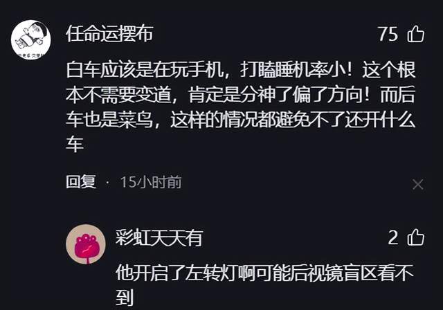白车应该是在玩手机,打瞌睡机率小!这个根本不需要变道,肯定是分神了偏了方向!而后车也是菜鸟,这样的情况都避免不了还开什么车