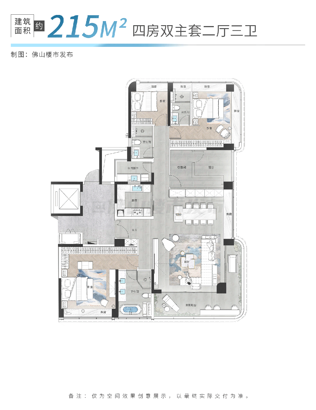 其中,建面约215平的户型,为端厅设计,带双主卧套房,270°环幕弧形转角阳台……空间尺度感很强,还能够直面中央园林。