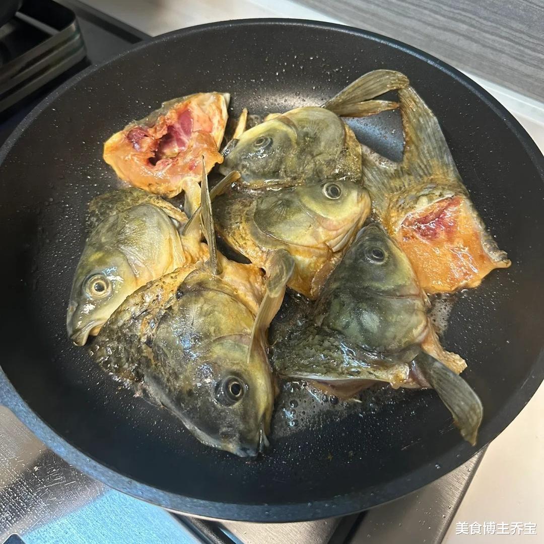 1、起锅烧油,油热之后,把鱼头放入锅中,小火慢煎。别着急翻面,等一面煎至金黄,再轻轻翻面煎另一面。这时候,你能听到锅里滋滋作响,闻到一股特别香的鱼香味。煎好的鱼头盛出来放在一旁备用。
