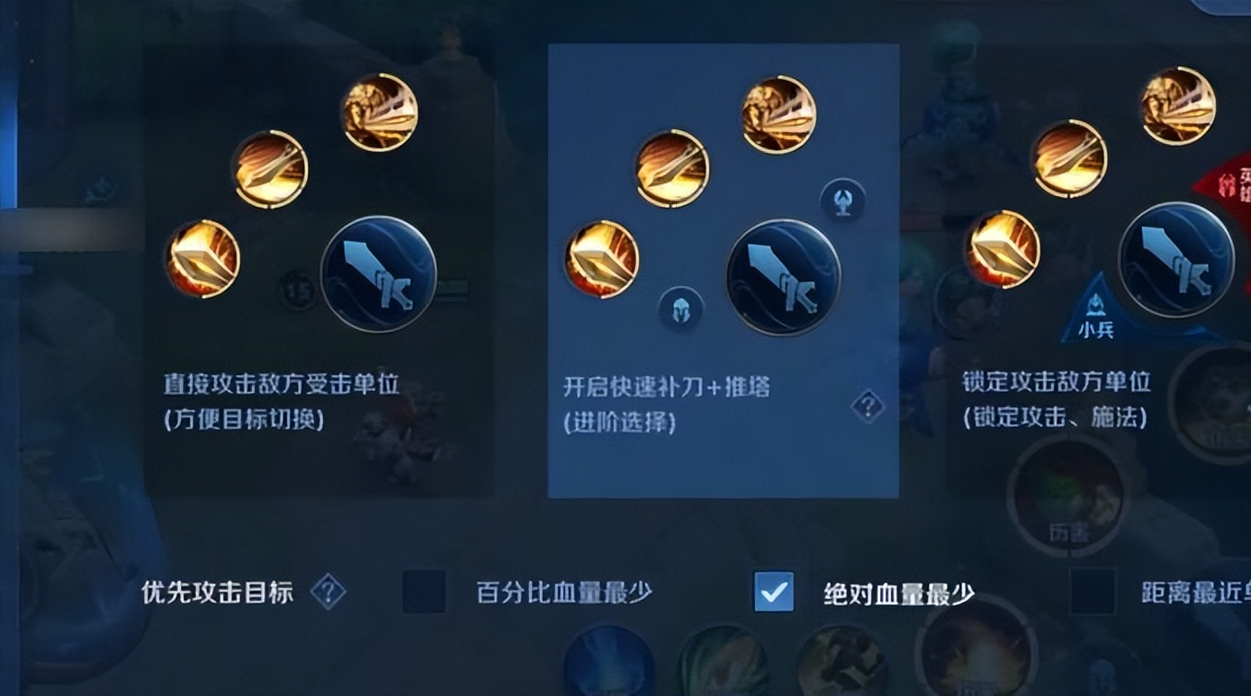 当敌人在我们攻击范围之外,扫射范围之内时,就会根据操作设置优先攻击血量最少的目标。