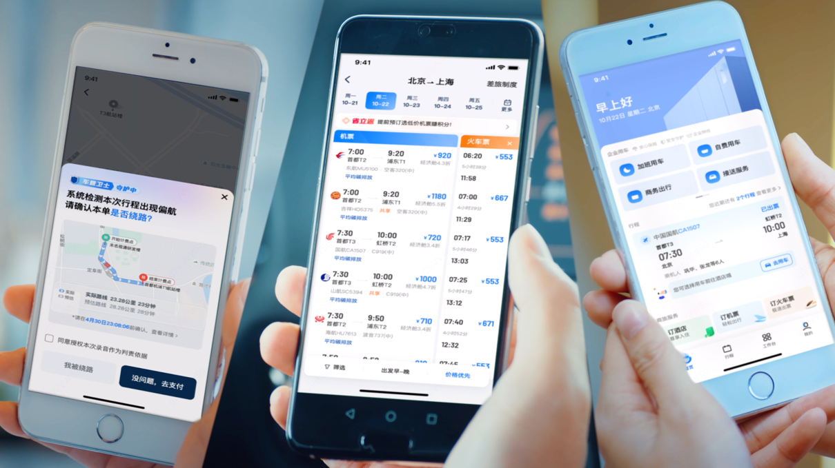 【图为通过一个“滴滴企业版”App,可以完成用车和机酒火的便捷体验。】
