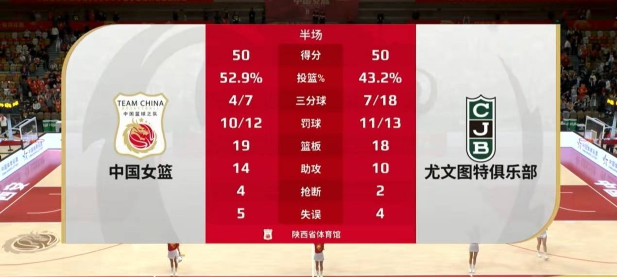 上半场,尤文图特队出手18次三分球,共命中7记三分。中国女篮韩旭8分2板2助攻,张子宇7分3板,罗欣棫7分1板,田媛媛6分2板,陈明伶6分1板,张茹5分2板,杨舒予4分2板6助攻,陈玉婕2分1板1助攻,王馨雨2分1助攻,李缘4板2助攻。