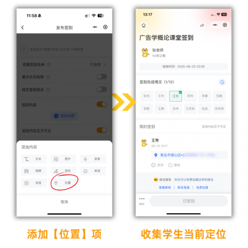 发起一条“签到接龙”,添加【位置】,即可收集参与学生的当前位置。