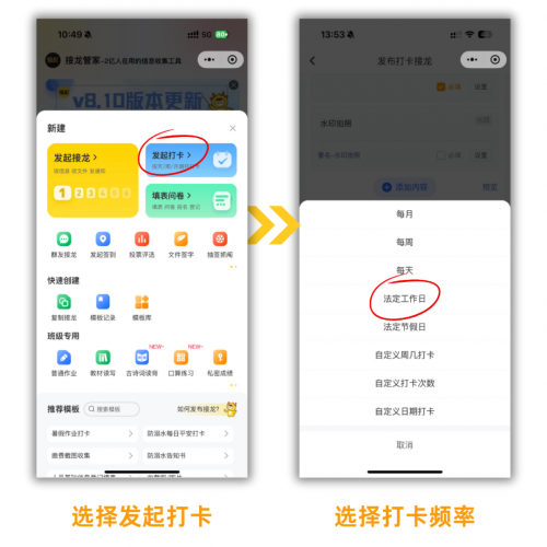 用“接龙管家”小程序点击中间的“+”,选择【发起接龙】【发起打卡】【发起签到】(或者搜索“签到”关键词,选择合适的模板,效率更高哦)