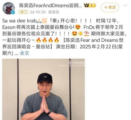早在去年 10 月,陈奕迅工作室就官宣了他将于今年 2 月在泰国曼谷举办演唱会的消息。
