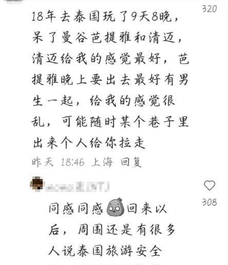 有位在泰国游玩了十天左右的网友表示:“我去清迈感觉还不错,挺好玩的。但去芭堤雅的时候就觉得那里很乱,总是担心会在某个巷子里突然被人拉走。”