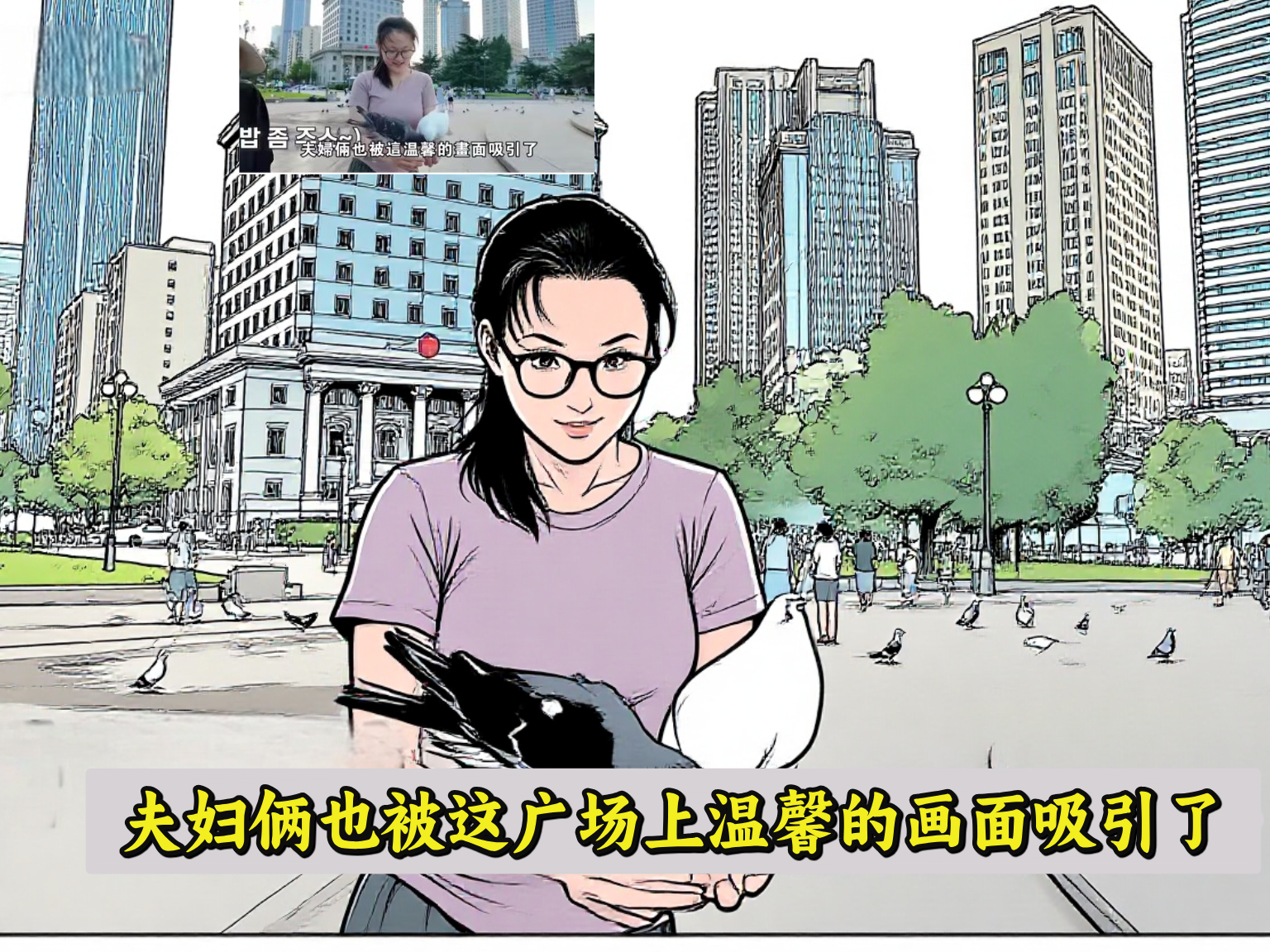 成群的鸽子在广场上觅食,喂鸽子的市民和散步的老人构成了一幅和谐的画面,夫妇俩也被这温馨的画面吸引了。