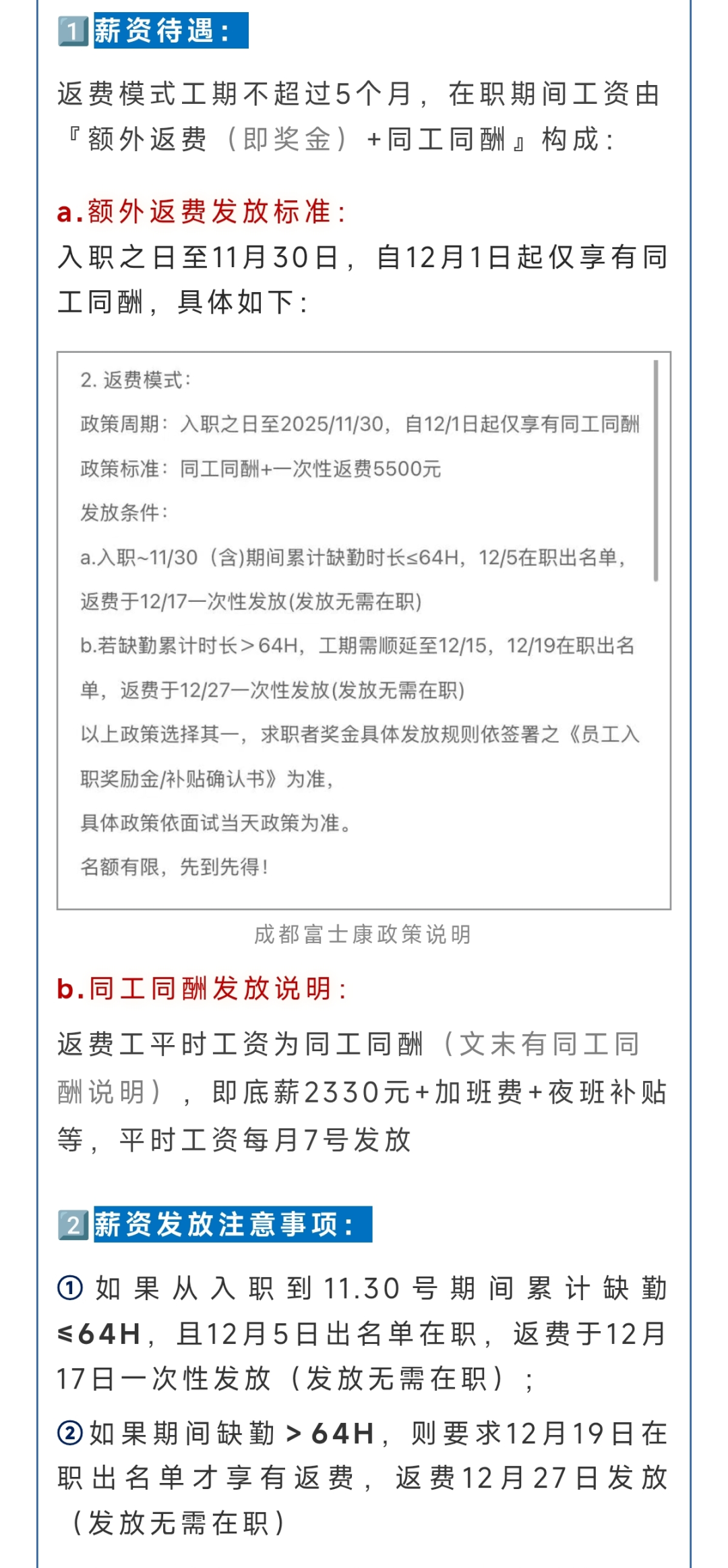 重要提示:返费的发放通常与工作时长挂钩,若未干满 4-5 个月,可能无法拿到全额返费。因此更适合有明确中期规划,能稳定工作 4-5 个月,想通过 “基础工资 + 返费” 提升整体收入的求职者。