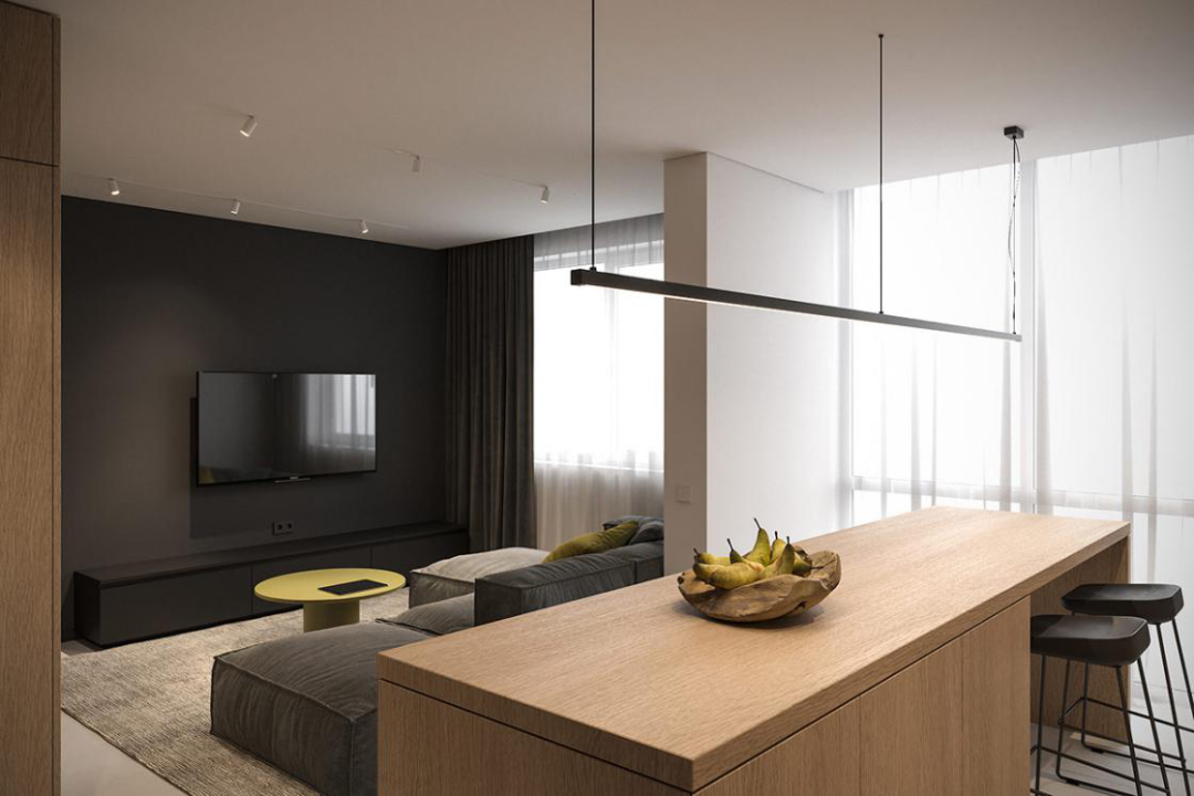 客厅基本没有冗杂繁琐的装饰,简洁大方,整个区域以原木色为主色,给人一种质朴自然,怎么也看不腻,姜黄色的圆桌抱枕与灰色沙发相搭配,则赋予空间活力。