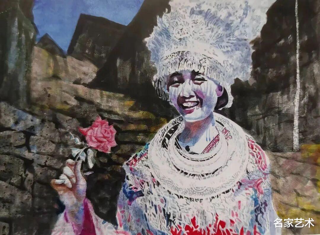 丁远阁 《阳光照苗寨》 水彩画