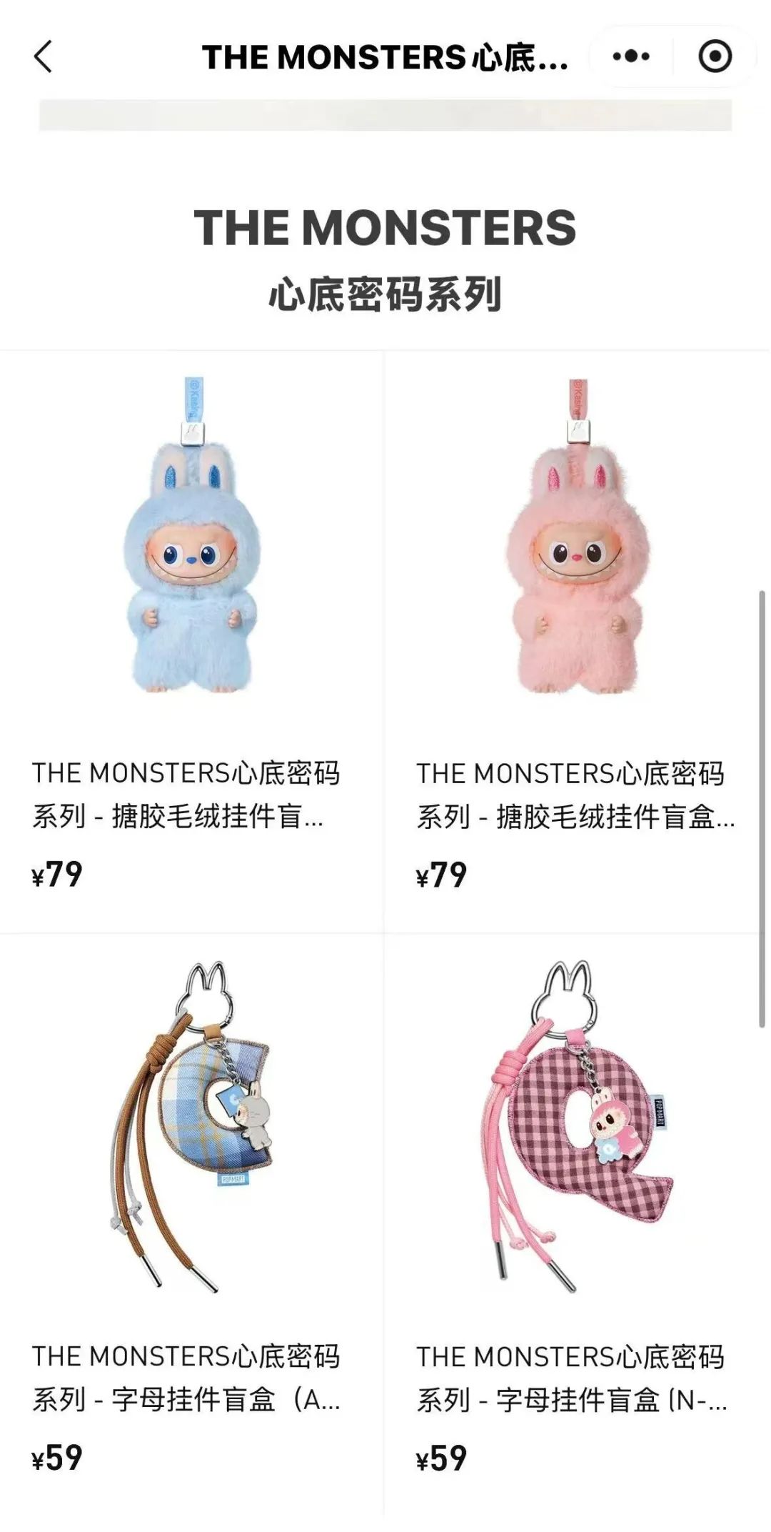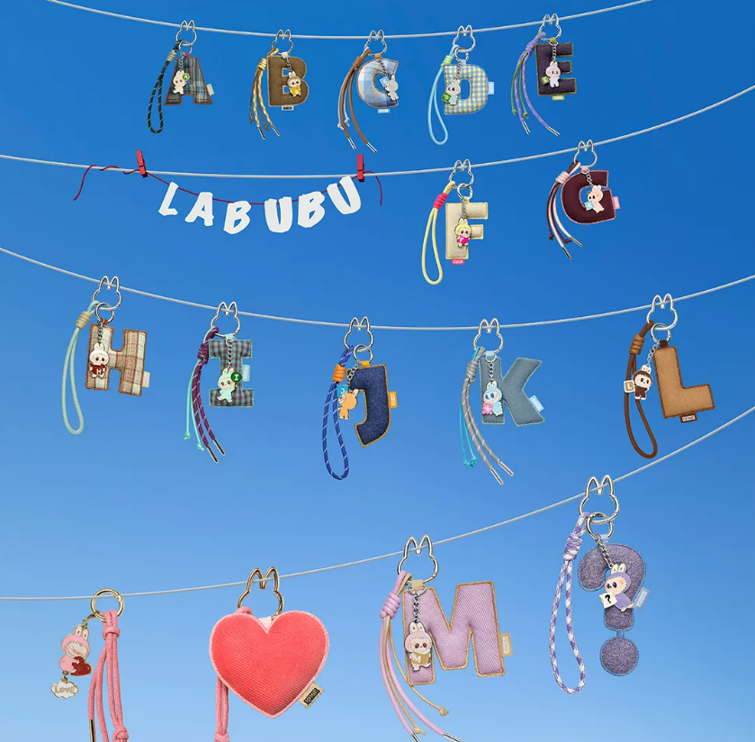 miniLABUBU总共有30个款式,按字母“A-M”“N-Z”分为两个系列,各有14个常规款和1个隐藏款,高度10.5cm,配色均为纯色,单个定价79元,端盒价格1106元。与其一同推出的还有单盒定价59元,款式同样多达30种的字母挂件盲盒,每款设计都与miniLABUBU进行了一一配套。
