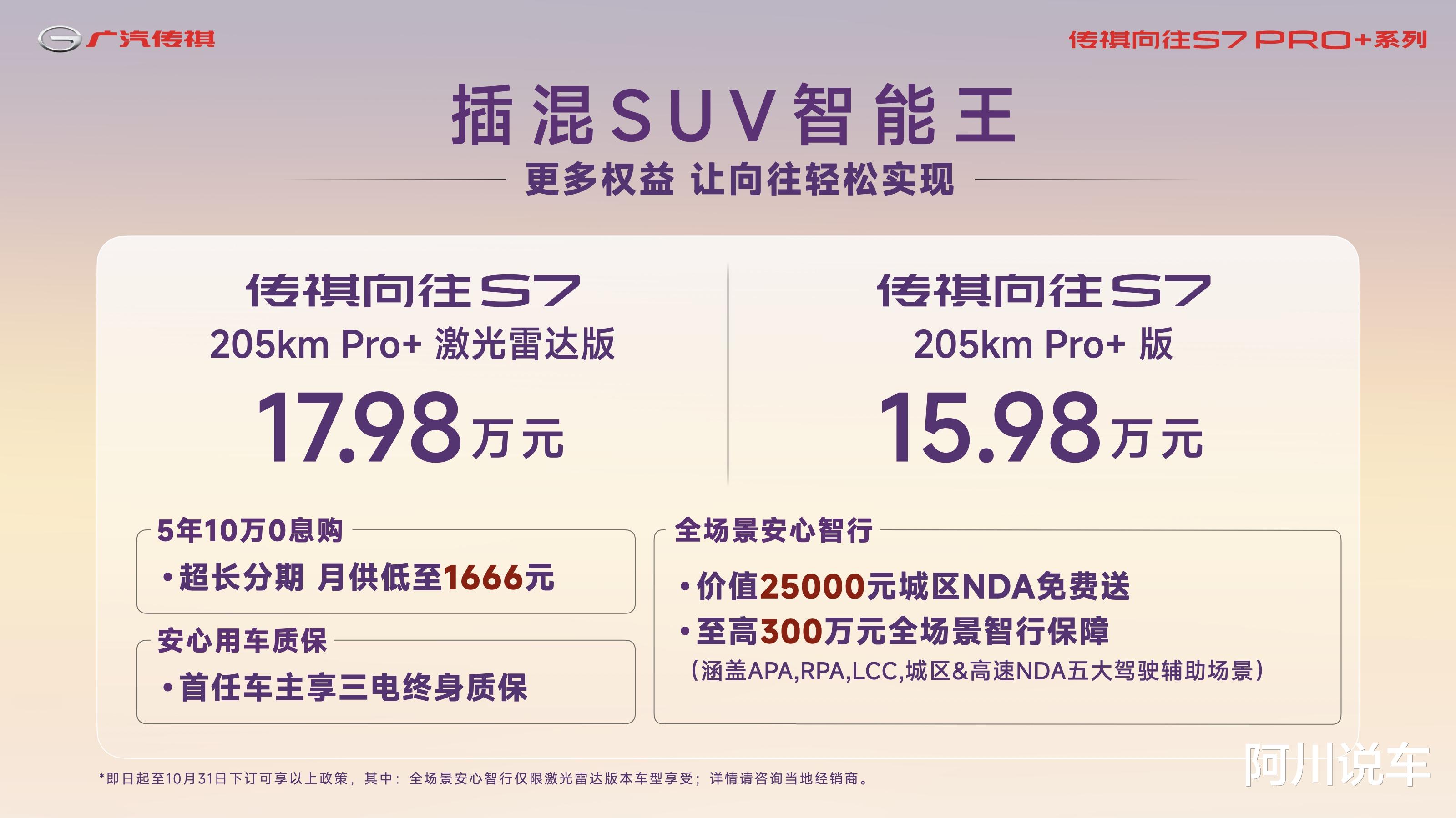 同时,作为向往系列第一车,传祺向往S7全新Pro+系列售价15.98万元起,更带来传祺史上最给力的金融政策:5年10万0息,月供低至1666元,还有价值25000元城区NDA免费送、至高300万元全场景智行保障,首任车主还可享三电终身质保,真正让“向往的生活”触手可及。