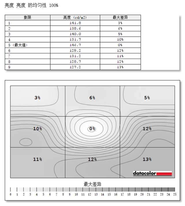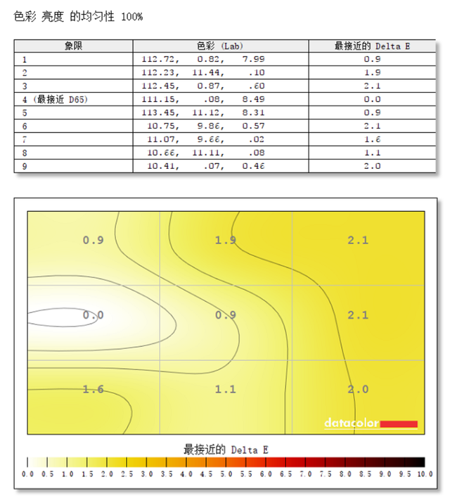 九区100%亮度偏差最大13%,最小的中间位置则是0%,均匀性最大偏差 6 %,而色彩偏差Delta E为最接近D65为0%,没有可见脏屏;对于非印刷级用户,它足以同时兼顾游戏和修图。