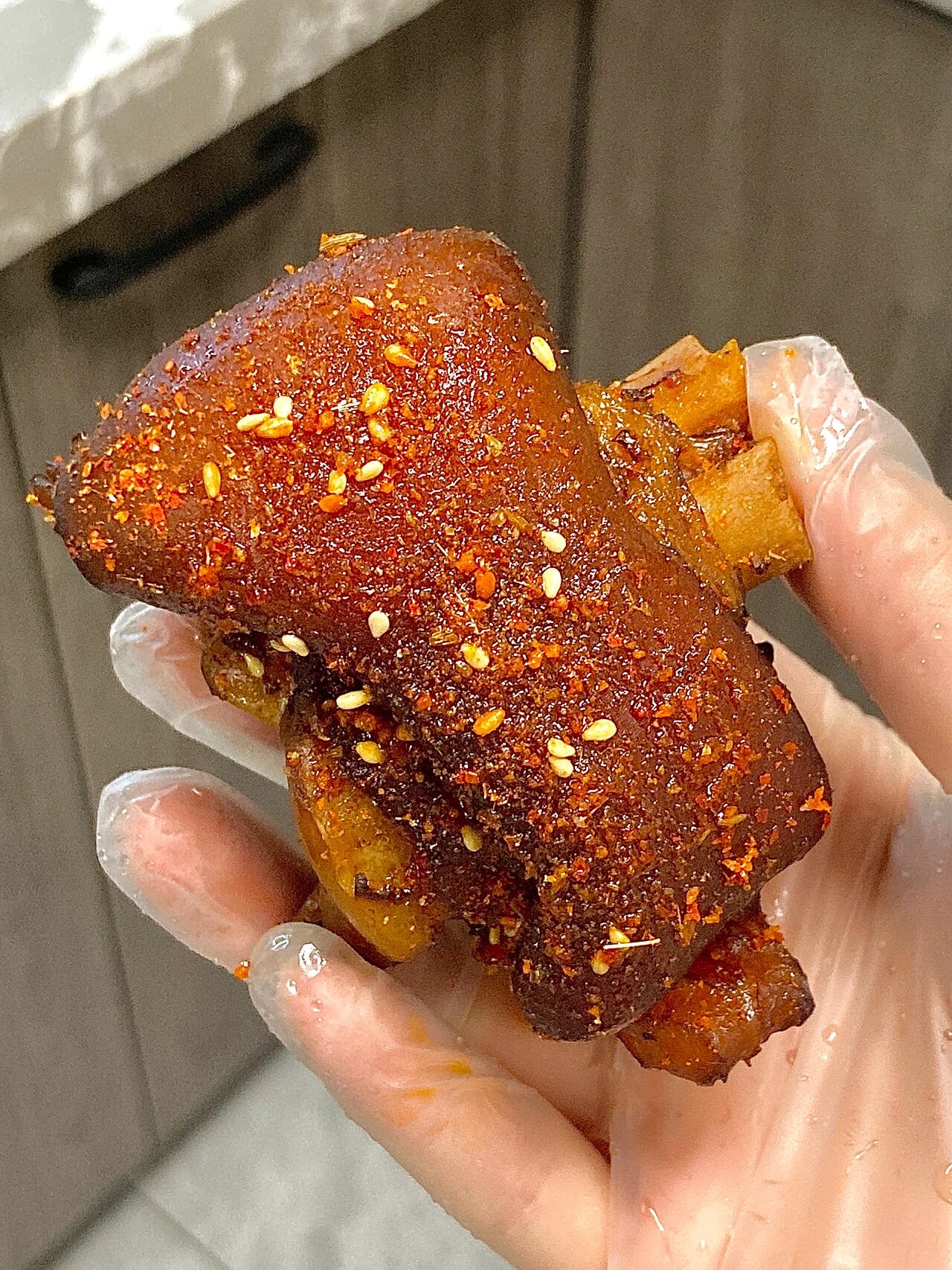 咔嚓……当锋利的餐刀划开焦糖色的猪蹄表皮,琥珀色的胶质裹着油光缓缓绽开,混合着孜然与辣椒的香气瞬间攻占鼻腔。我望着盘子里堆成小山的烤猪蹄,突然想起上周在烧烤店排队时,前面还有23位客人的绝望。而现在,只要打开冰箱就能端出媲美夜市摊的销魂美味,这都要感谢那位在评论区留下神仙配方的网友!