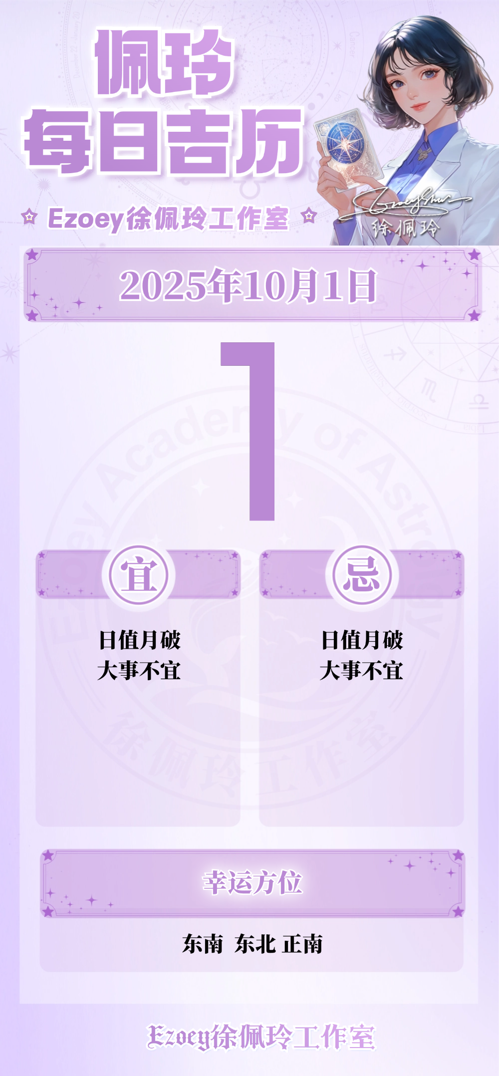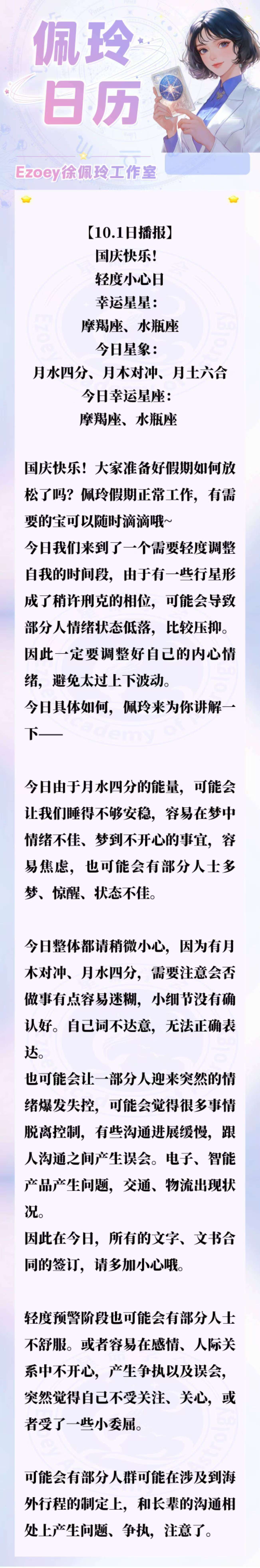 国庆快乐!大家准备好假期如何放松了吗?佩玲假期正常工作,有需要的宝可以随时滴滴哦~今日我们来到了一个需要轻度调整自我的时间段,由于有一些行星形成了稍许刑克的相位,可能会导致部分人情绪状态低落,比较压抑。因此一定要调整好自己的内心情绪,避免太过上下波动。今日具体如何,佩玲来为你讲解一下