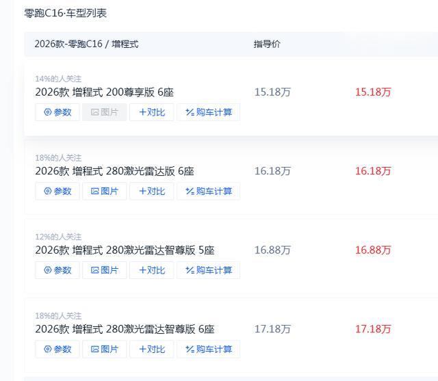 说到价格,2026 款零跑C16 的指导价在 15.18 万到 17.18 万之间,这个价位能买到这么大空间、高配置的中大型 SUV 确实很划算。比如增程式 280 激光雷达版 6 座车型 16.18 万,纯电版 580 尊享版 6 座 16.18 万,对比同级别车型,同样的预算能买到更多实用配置。很多家庭用户都是对比了好几款车后选的零跑C16,觉得它在空间、配置、价格之间找到了很好的平衡,特别适合多人口家庭使用。