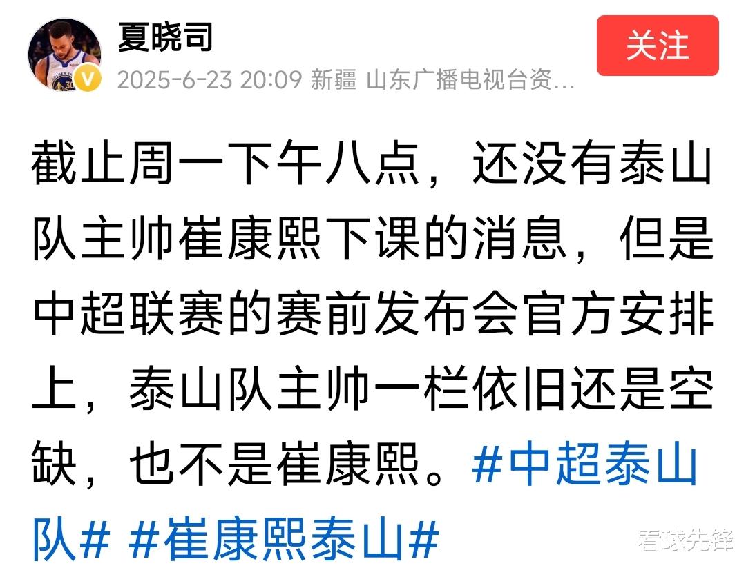 据媒体人夏晓司消息,尽管山东泰山方面没有宣布崔康熙下课,但留给崔康熙时间不多了,球队正在变化!以下为媒体人发文:“截止周一下午八点,还没有泰山队主帅崔康熙下课的消息,但是中超联赛的赛前发布会官方安排上,泰山队主帅一栏依旧还是空缺,也不是崔康熙。”