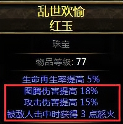 珠宝:找最优稀有黄色珠宝图腾伤害、攻击伤害、被敌人击中+3盛怒的即可,戴上3颗,怪打我们一下获得9个盛怒,3下基本就满怒了,非常好用。不差钱的兄弟直接买赛季深渊掉落的双额外增伤的水井之心宝钻,这个珠宝只能装备1颗,只能告诉你这个非常贵,伤害比我们这个稀有珠宝高点。