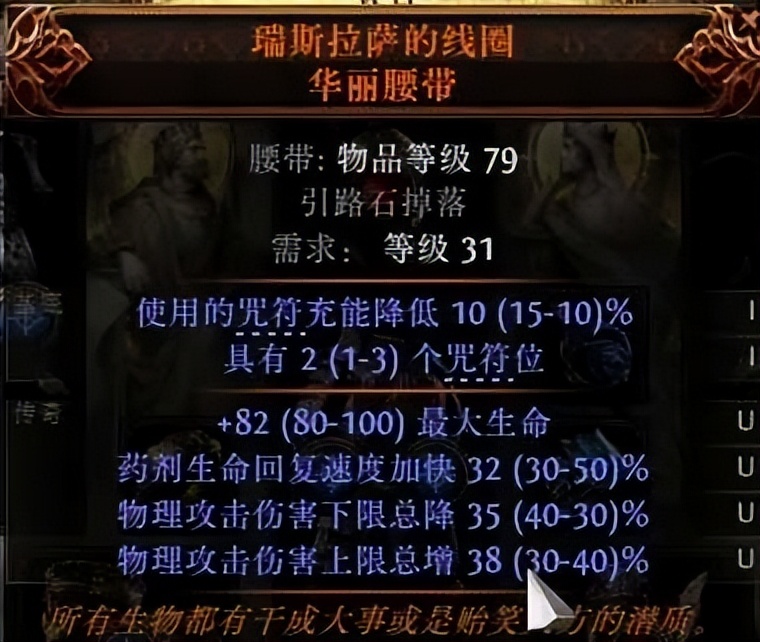 腰带:我这里直接换了增加物理伤害的瑞斯拉萨的线圈华丽腰带,这个腰带能给我的物理伤害提升非常的大。你也可以选择3护符稀有装备、最大生命120+、抗性其他缺什么补什么。