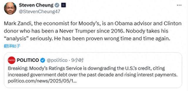 观察者网:2025-05-17:穆迪下调美国信用评级,白宫急了:这是政治决定