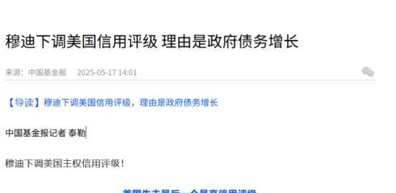 中国基金报:穆迪下调美国信用评级 理由是政府债务增长