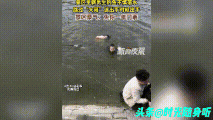 视频中,一名黑衣男子连上衣都来不及脱,便奋力地在河中拖拽着一名落水男孩。