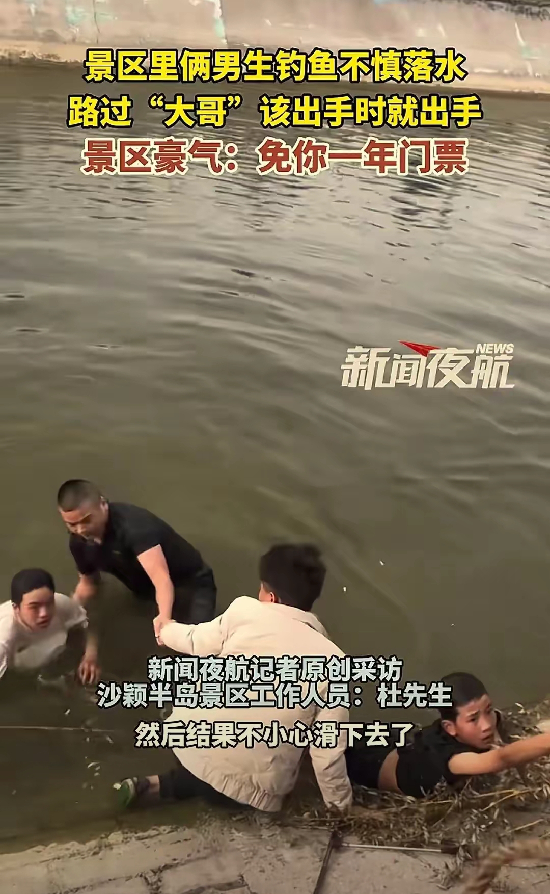 2025年4月19日,周口市沙颖半岛景区内发生了一起惊心动魄的落水事件。两名男孩在垂钓时不慎滑入水中,他们自救无果,情况十分危急。幸运的是,一名路过的黑衣男子见状毫不犹豫地跳入水中,舍己救人。在黑衣男子的英勇营救下,两名落水男孩最终被成功救上了岸,事故并未造成人员伤亡。目前,相关部门正在对此事进行进一步处理。