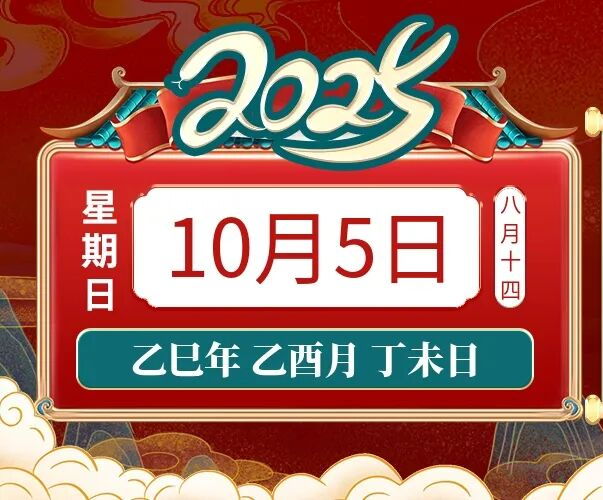 2025年10月5日,星期日,农历八月十四 (乙巳年乙酉月丁未日),法定节假日。