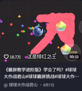 霸屏挑战的整个对战过程的物理反馈做得相当出色。球球被挤压时的弹性、合体时的体验,每一个细节丝滑、魔性的都让你莫名舒适。抖音上最火的视频类型,就是各种“球球变形记”——被压成饼的、被逼至墙角的、快速穿梭等等。