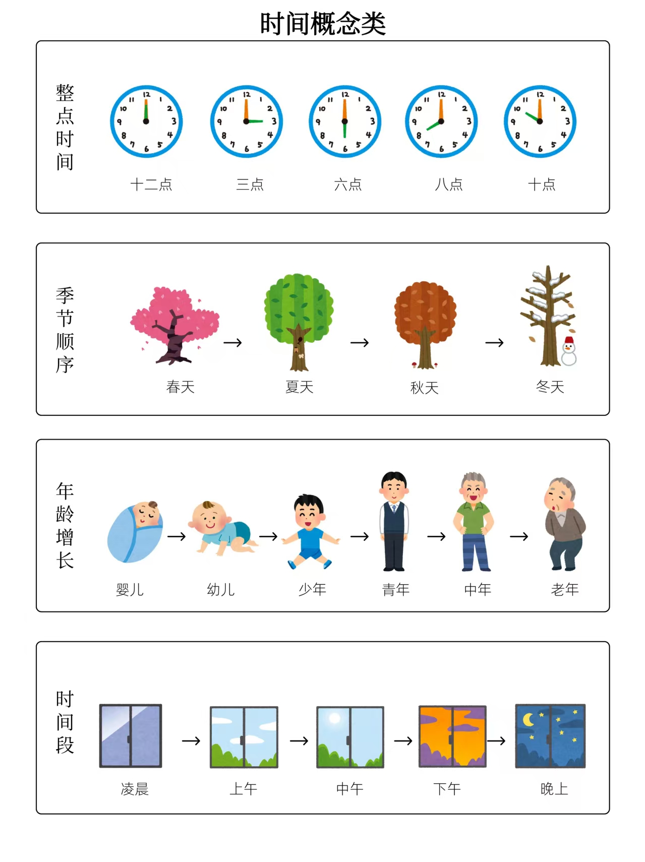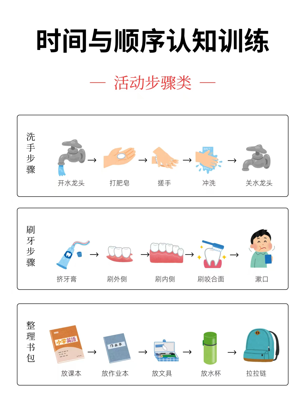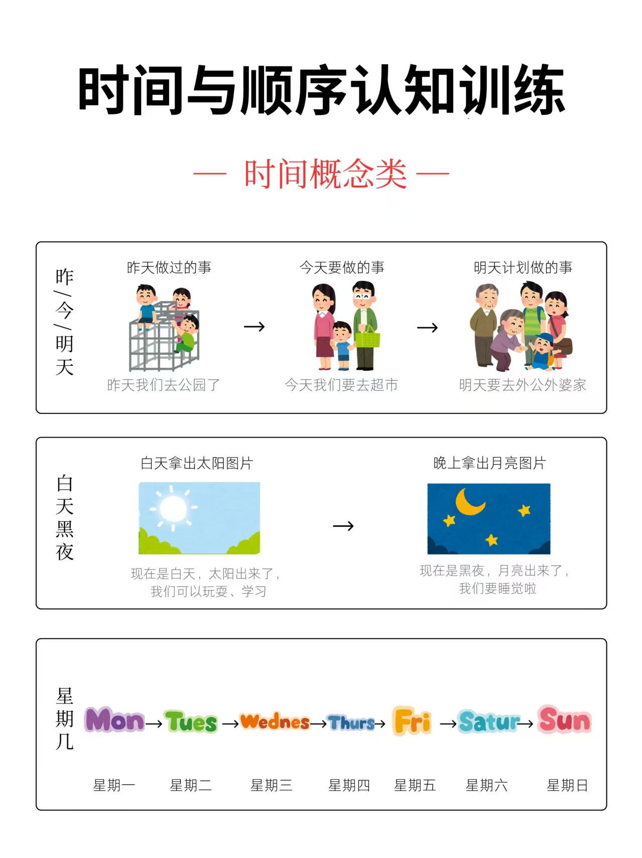 反之,如果孩子缺乏时间与顺序认知能力,会影响对日常活动的安排、理解事件发展逻辑等等。