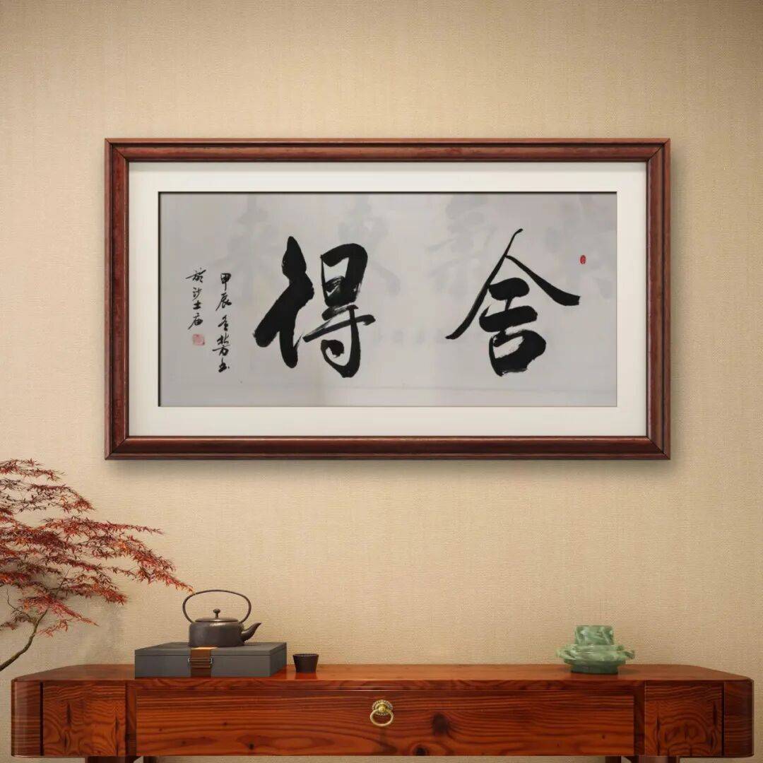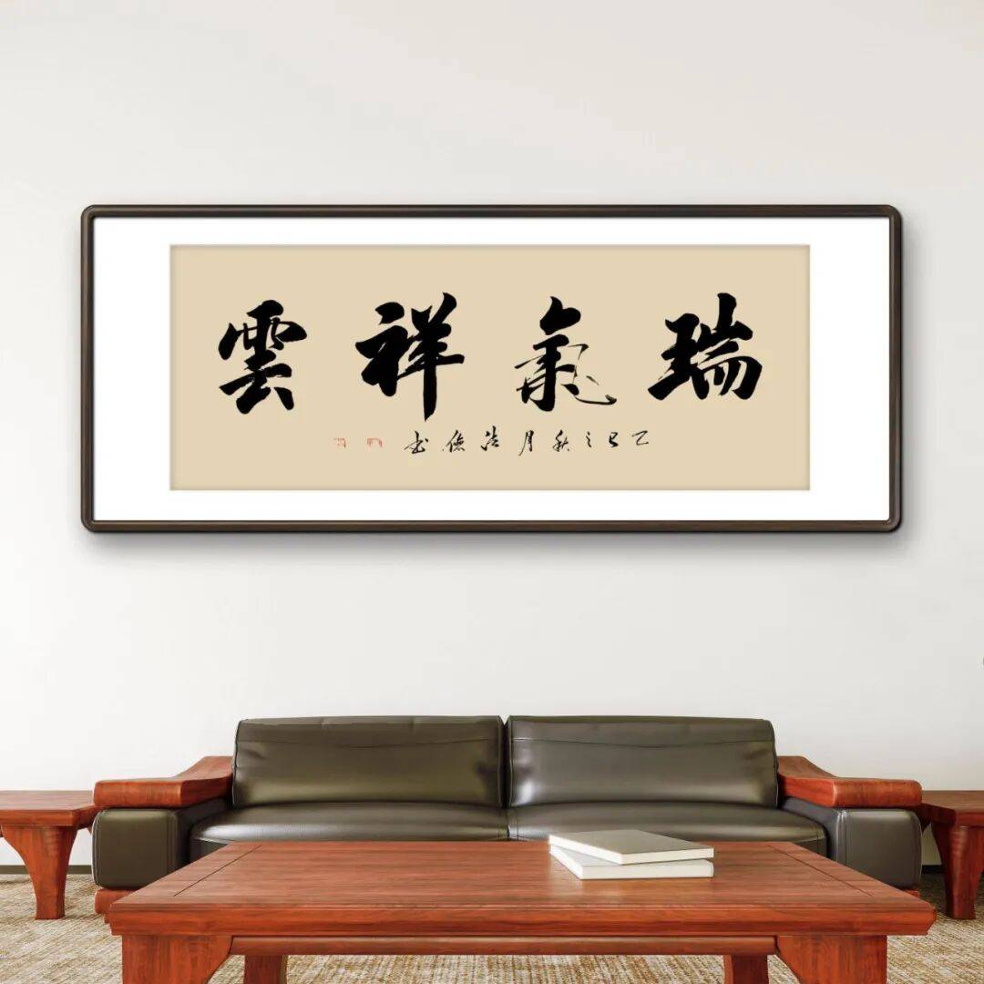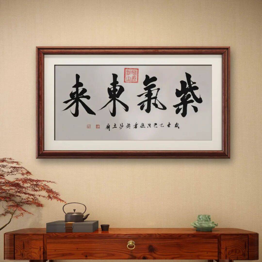 在行草的创作上,周法俭则多取法“二王”(王羲之、王献之)及宋四家等经典谱系。“二王”书法以其潇洒飘逸、气韵生动的特点,成为行书乃至整个书法艺术的巅峰代表之一。周法俭先生对“二王”书法的汲取,着重于其笔法的灵动与结字的欹侧变化。他的行书作品,笔画牵丝映带自然流畅,字与字之间的呼应连贯而富有韵律,如“紫气东来”,四字一气呵成,笔势连绵,既体现出“二王”书法的灵动洒脱,又融入了自身对笔势节奏的理解,使得作品在传统的框架内焕发出新的生机。这种对经典行草的研习,让他的书法在保持传统韵味的同时,具备了更为活泼的艺术表现力。