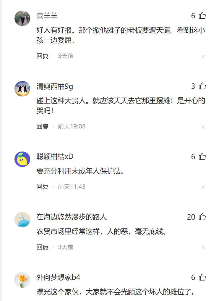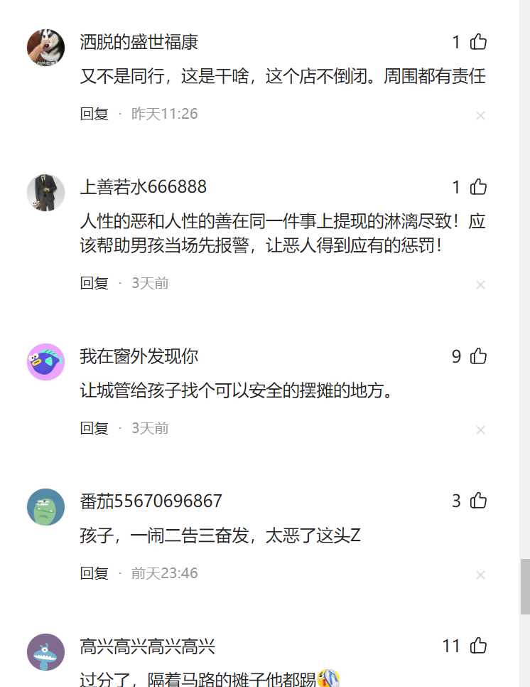 有网友说,一个未成年的孩子不是生活所迫,他会出来摆摊吗?又不是竞争对手,也没给你使坏。一个成年人竟然去欺负个未成年的孩子,这种胸襟狭隘的人做生意发不了财,也不可能做得下去。
