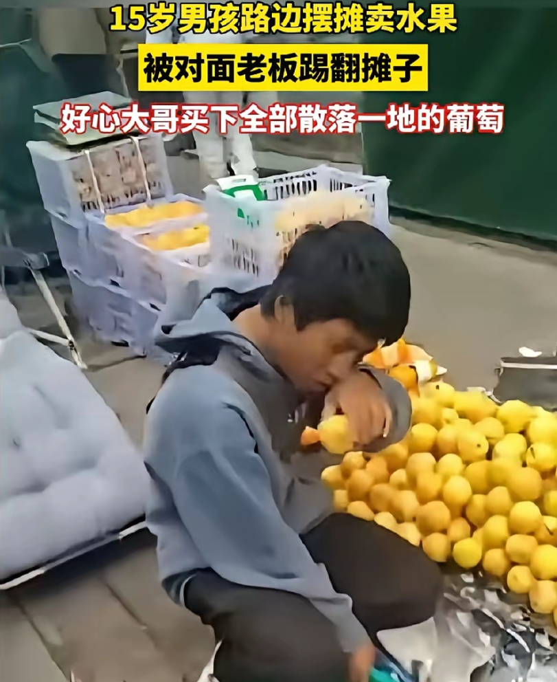 这个世界破旧不堪,可总有人在缝缝补补。这时一旁的大哥看不下去了,直接蹲下来帮男孩捡起了葡萄,对男孩安慰道:“孩子,别哭,叔这些葡萄我全买了”