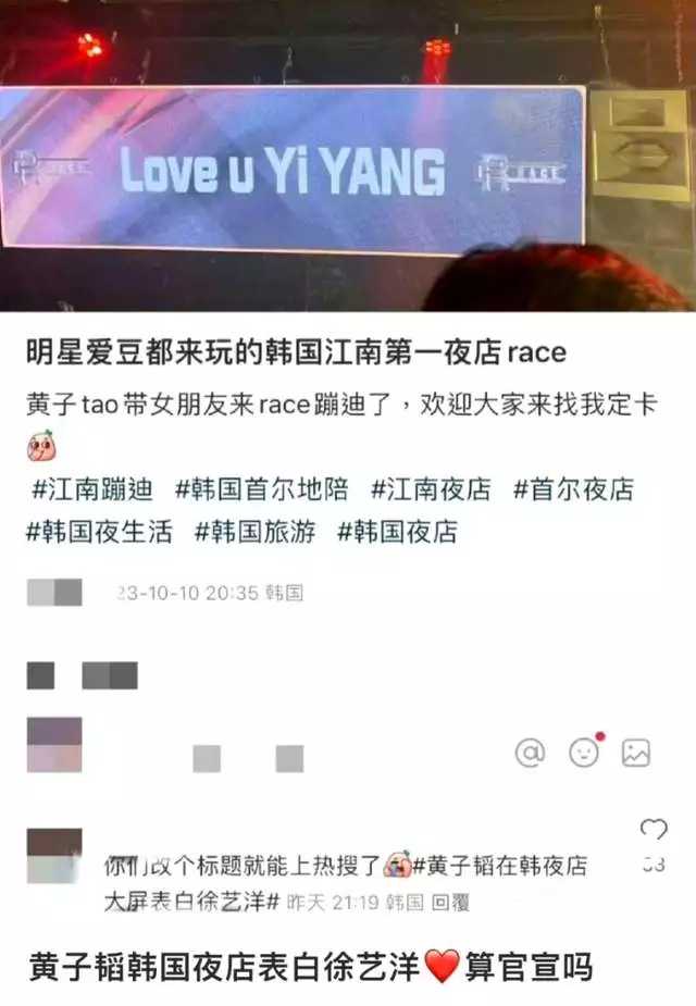 据说,此次出行黄子韬所带的公司女同事就是徐艺洋,两人一起喝酒蹦迪,黄子韬更是在韩国夜店一掷千金,购买了一个大屏幕,打上了英文向徐艺洋表白。虽然大屏上没有黄子韬的名字,但网友一看就知道是出自谁之手。