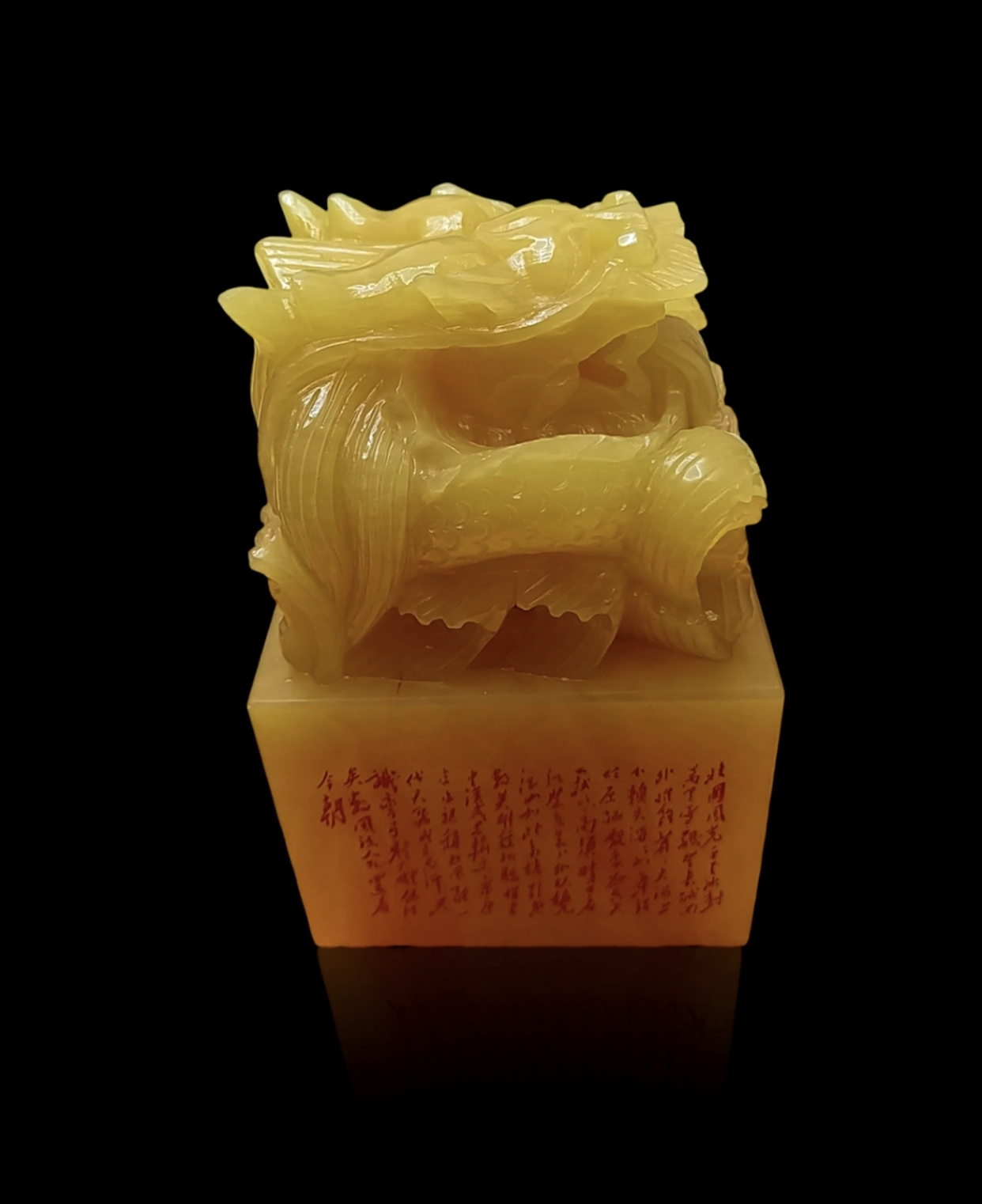 玺钮雕刻为一尊盘踞的巨龙:龙身蜷曲有力,龙首昂扬向天;龙鳞以 “减地浮雕” 技法层层雕琢,鳞片厚薄均匀、边缘清晰,光线照射下折射出层次光泽;龙须以 “阴刻” 手法细勾勒,飘逸灵动却不失挺拔;龙爪紧握,筋骨毕现。