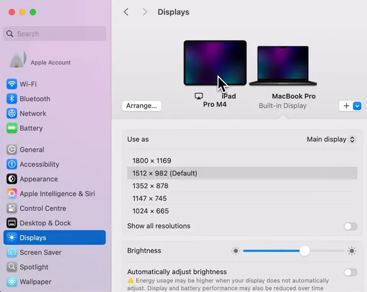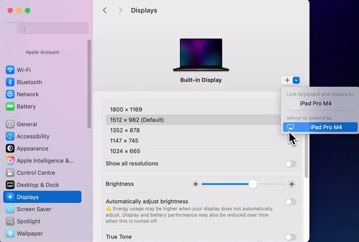在 macOS 里设置也不复杂,我在系统设置 > 显示里点了“+”,iPad 就出现在“镜像或扩展”选项里,选上以后一开始是镜像,改成“扩展显示”后就变成真正的双屏,我还在显示设置里把 iPad 拖到左边来,这样鼠标移动就顺手了;