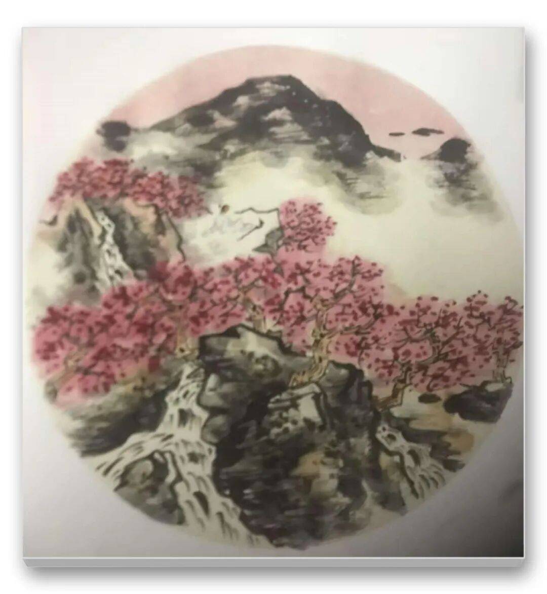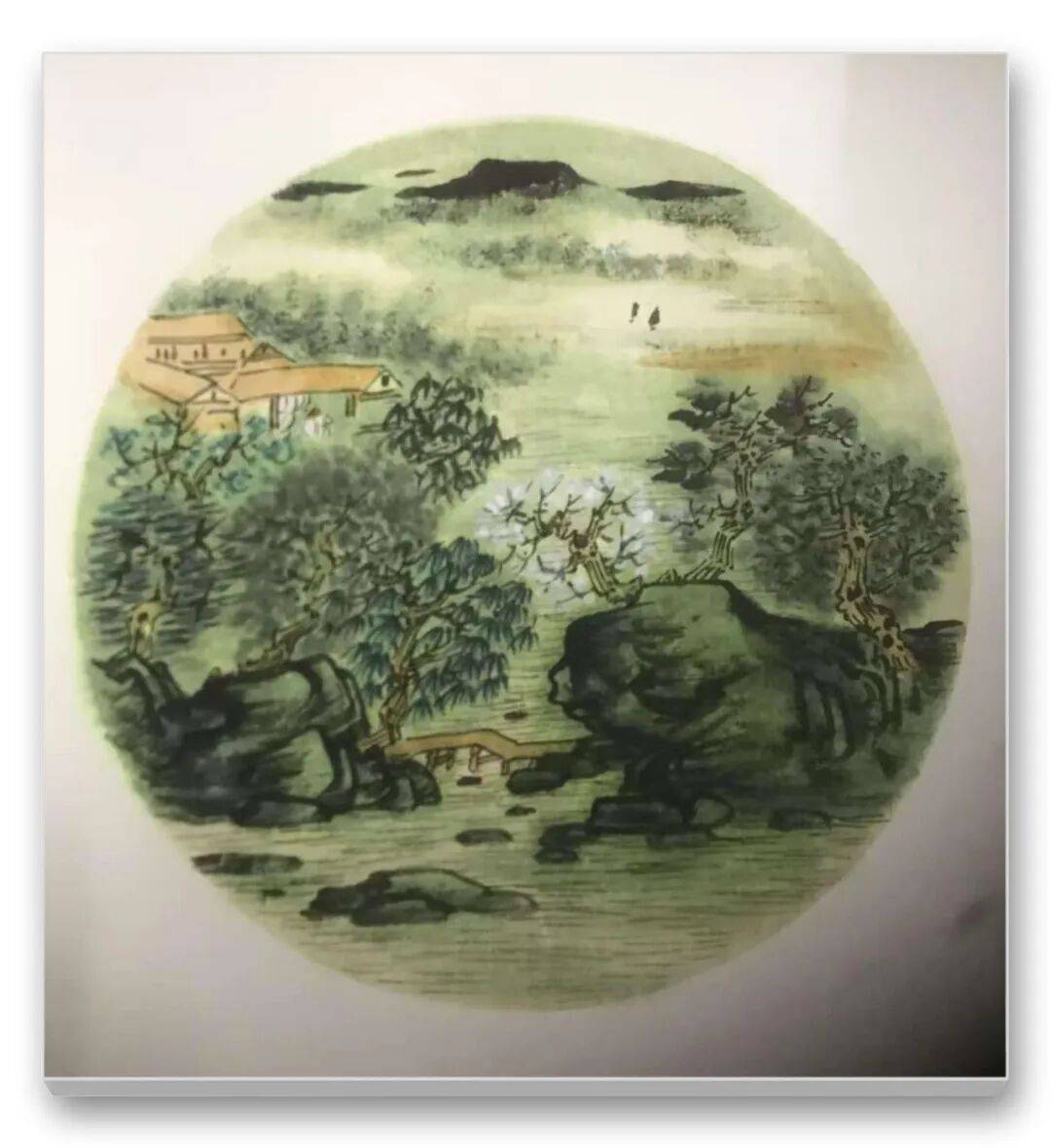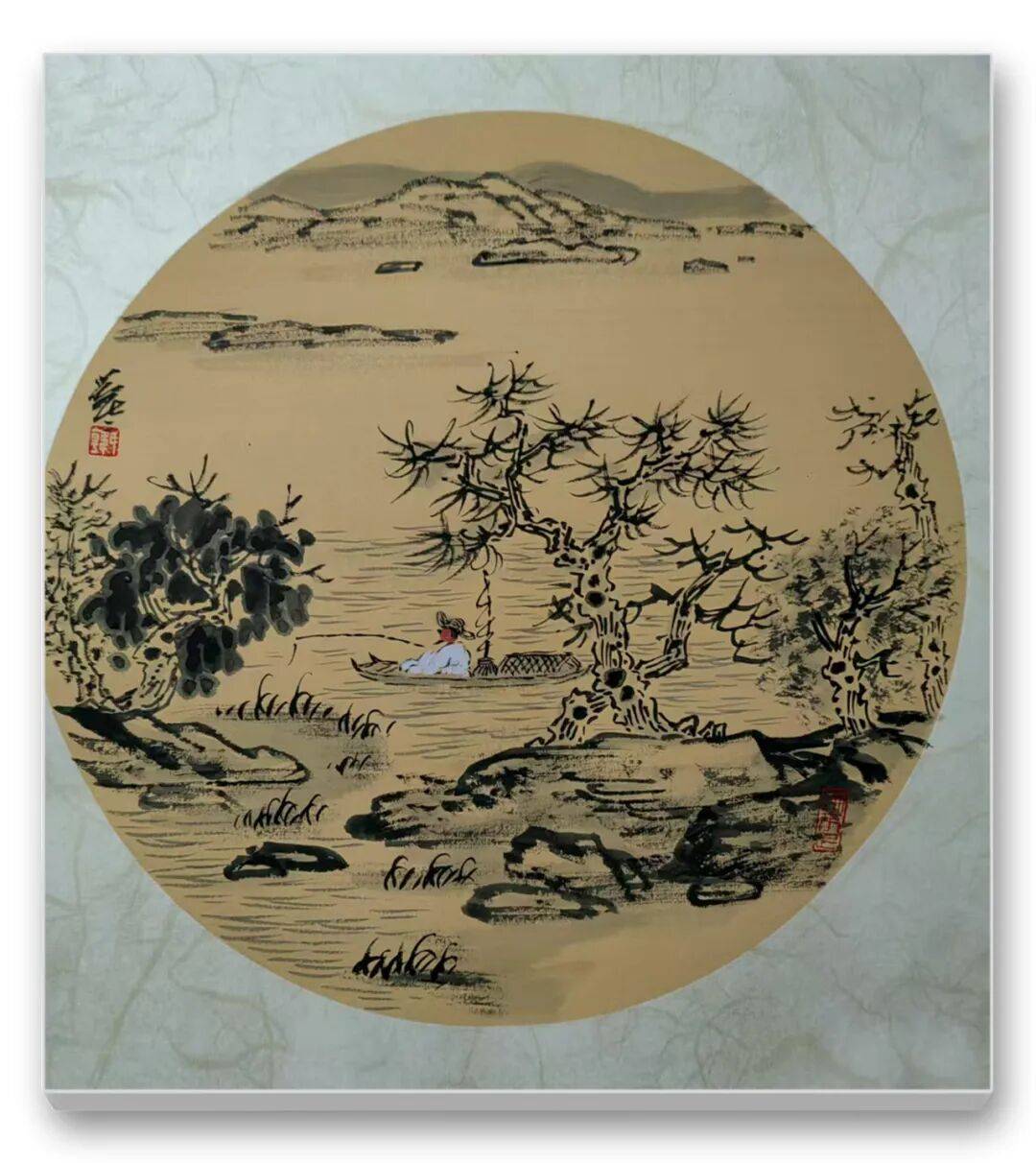 而其表现山水之清幽者,如诸多圆形扇面山水,更是别有一番意趣。画面常以山水、草木、屋舍、人物构成一方小世界,却在这小世界里营造出“小中见大”的深远意境。树木枝干虬曲,以简练而富有弹性的线条勾勒,尽显生机;山石造型奇崛,用墨或浓或淡,层次分明,似有温润质感;水面波纹轻浅,以细笔描绘,静中有动。偶有一人泛舟湖上,或于屋中闲坐,或在桥头伫立,人物虽小,却为画面增添了生活气息与人文温度,使这山水不再是冷漠的自然存在,而是充满了人的情感与意趣,宛如陶渊明笔下的世外桃源,让人心生向往,渴望投身其中,享受那份清幽与静谧。这种对“可居可游”之境的营造,正是中国山水画“以形媚道”精神的体现,韩长荣老师通过笔墨,将自己对理想生活与精神家园的追求,融入了这一方方山水之中。