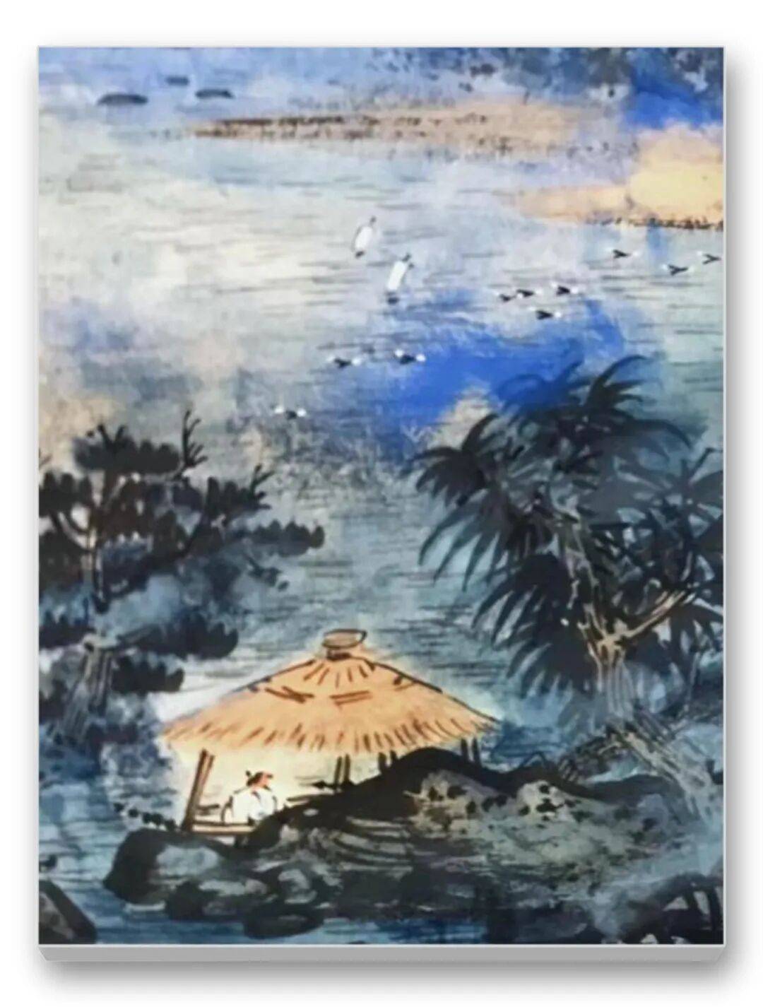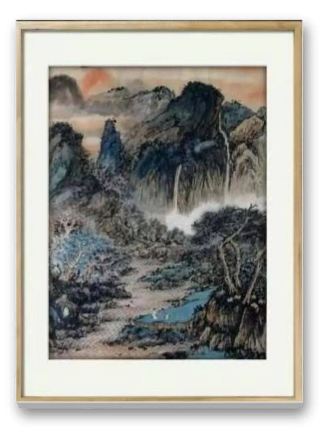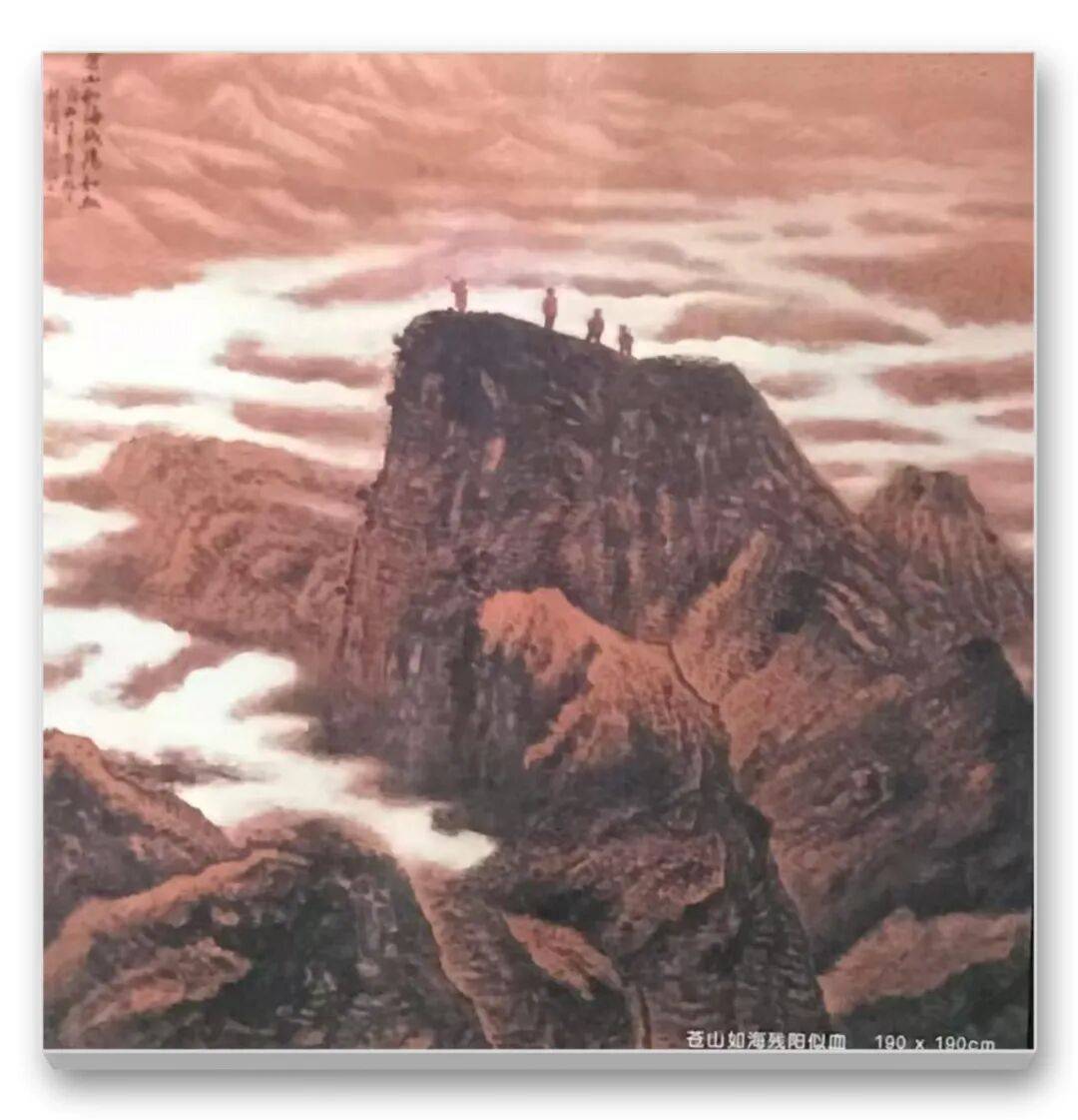 观其描绘山水之壮阔者,画面中群山如涛,奔涌起伏,云雾缭绕其间,似动似静。那厚重的山峦以浓淡相宜的墨色层层皴擦,既显岩石之肌理,又塑山体之巍峨。山顶数人立于其间,更衬出苍山之雄浑与天地之浩渺。此处笔墨,并非对自然的简单摹写,而是注入了画家对山河气魄的感悟与赞叹。那残阳如血的色调,为画面晕染出一抹悲壮而又充满力量的氛围,让观者感受到大自然的磅礴伟力,亦能从中体会到一种超越视觉的精神震撼,仿佛置身于历史的长河与天地的大化之中,心生“念天地之悠悠”的慨叹与敬畏。