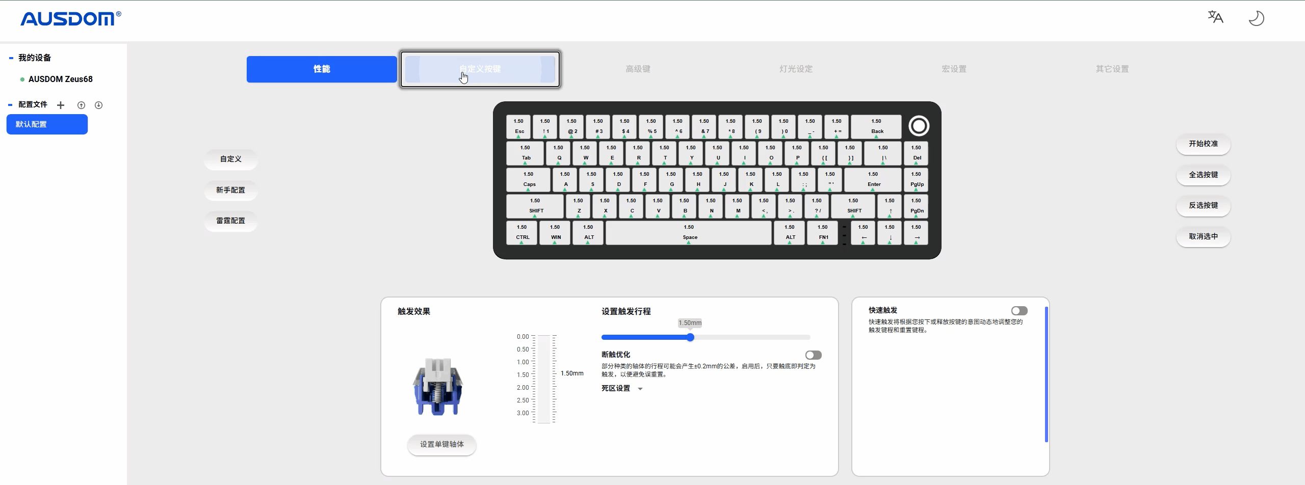 Zeus68磁轴键盘还配备了自研的HUB驱动系统,提供了丰富的自定义选项。你可以根据自己的需求,自由调节键程精度,范围从0.005mm到3.4mm不等。这一功能对于FPS游戏玩家来说尤为实用,它可以帮助你打造物理外挂级的操控体验,玩游戏更加游刃有余。