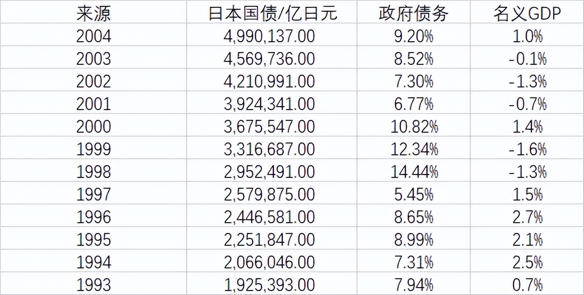 日本从1993年开始持续进入政府债务高增长(>7%),但名义GDP增长缓慢(低于2%)的情况,一直持续到2004年,