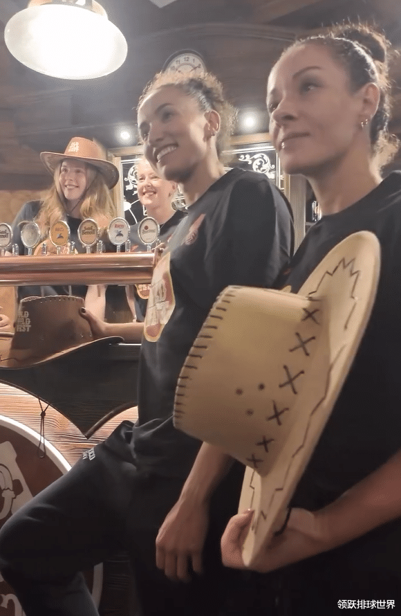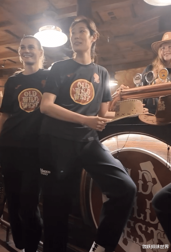 在活动现场,朱婷一改赛场上全神贯注的模样,穿上印有“OLD WILD WEST”字样的黑色T恤,与队友们一同走入极具西部风格的餐厅中,头戴牛仔帽,笑容满面,她时而将帽子遮脸搞怪,时而自然地倚靠在吧台边,与身边的队友亲密合影,气氛轻松愉快。