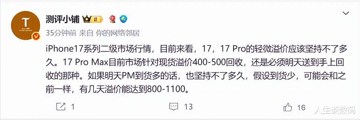 尽快出手:基础版 iPhone 17 和 Pro 机型,华强北加价已出现松动,部分商家开始压价;